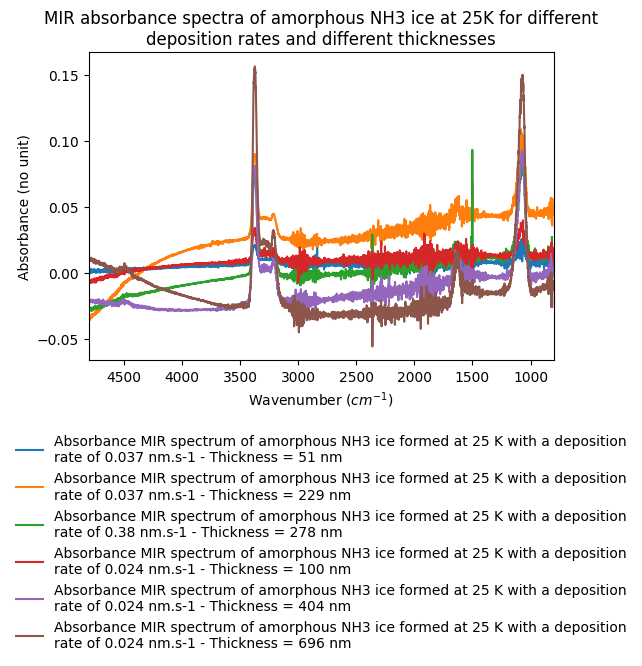 MIR absorbance spectra of amorphous NH3 ice at 25K for different deposition rates and different thicknesses