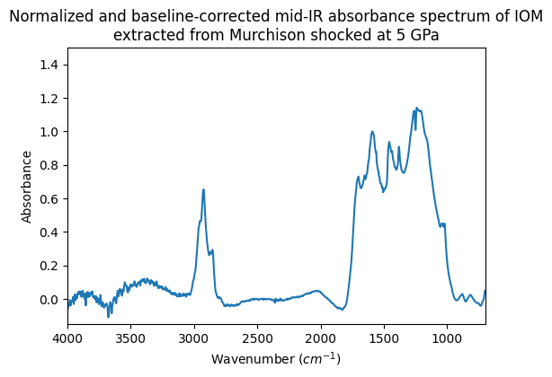 Normalized and baseline-corrected mid-IR absorbance spectrum of IOM extracted from Murchison shocked at 5 GPa