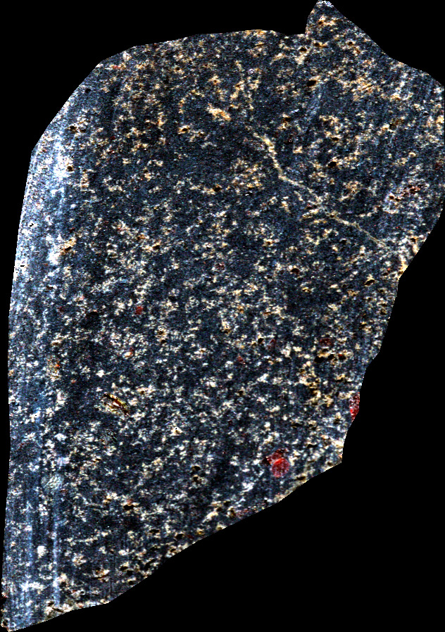 - NC11 sample cut in the form of a sugar. This volcanic rock is mainly composed of plagioclase, pyroxene and olivine.