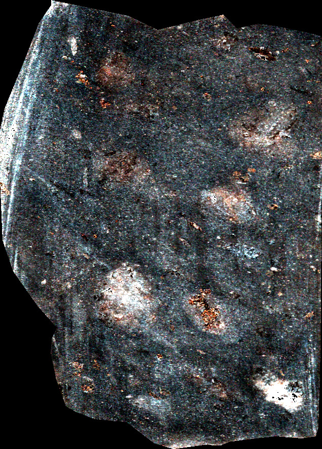 NC13 sample cut in the form of a sugar. This volcanic rock is mainly composed of plagioclase, biotite, amphibole, pyroxene and K-feldspar.