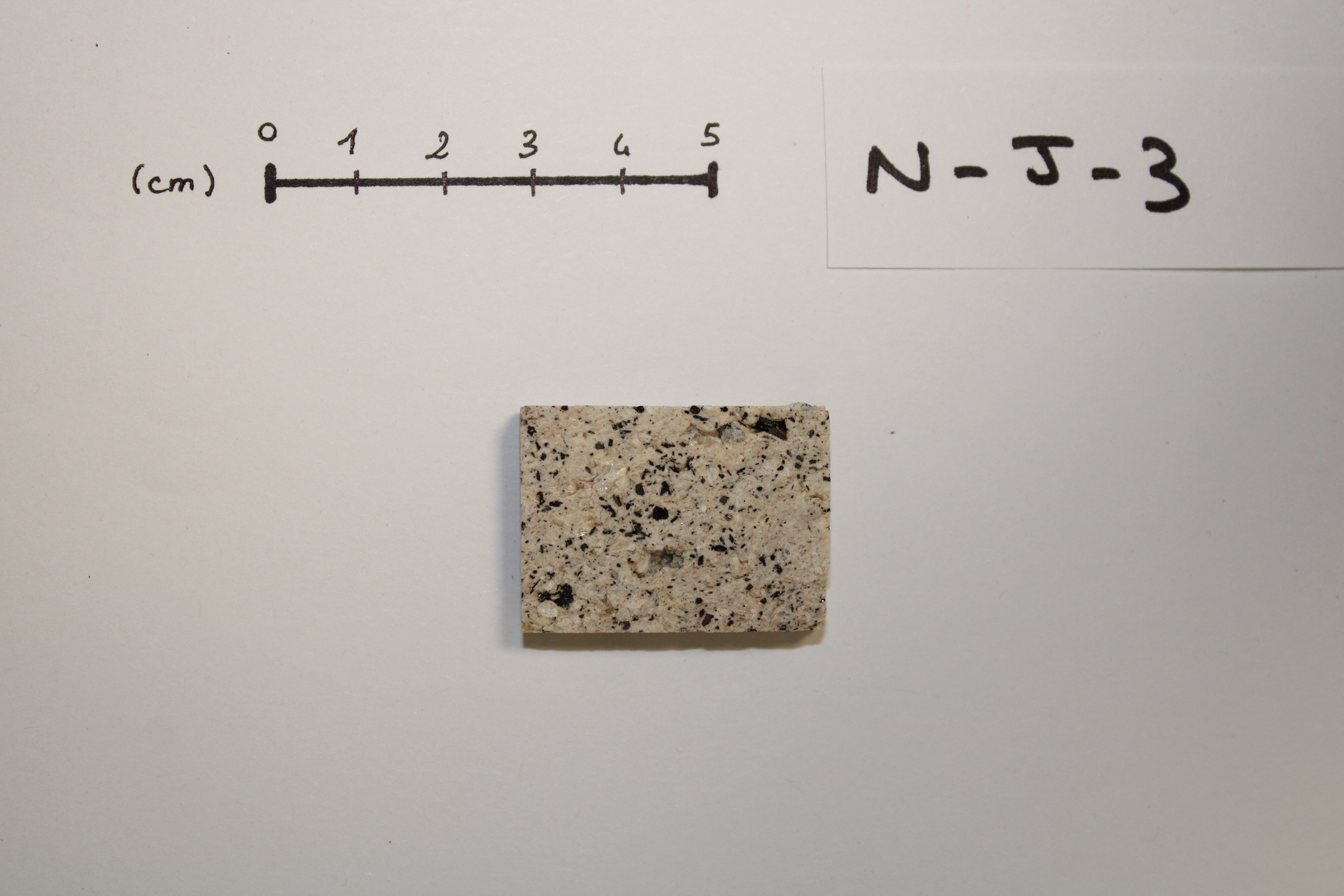 - NJ3 sample cut in the form of a sugar. This volcanic rock is mainly composed of plagioclase, biotite, amphibole and K-feldspar (origin : Atacama, CHILE).