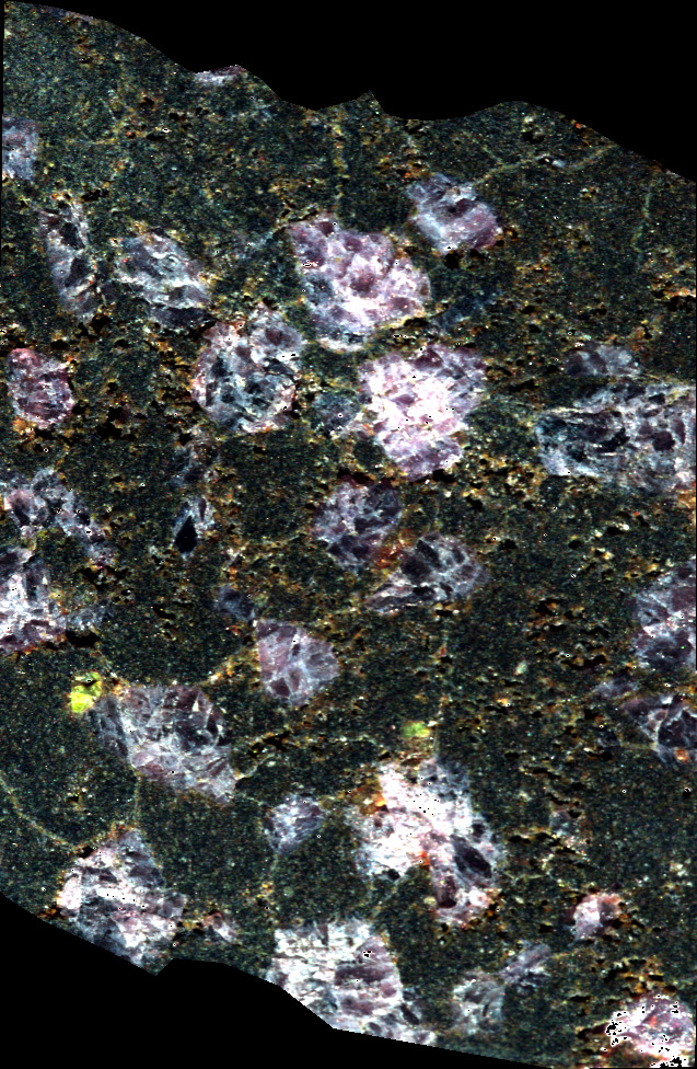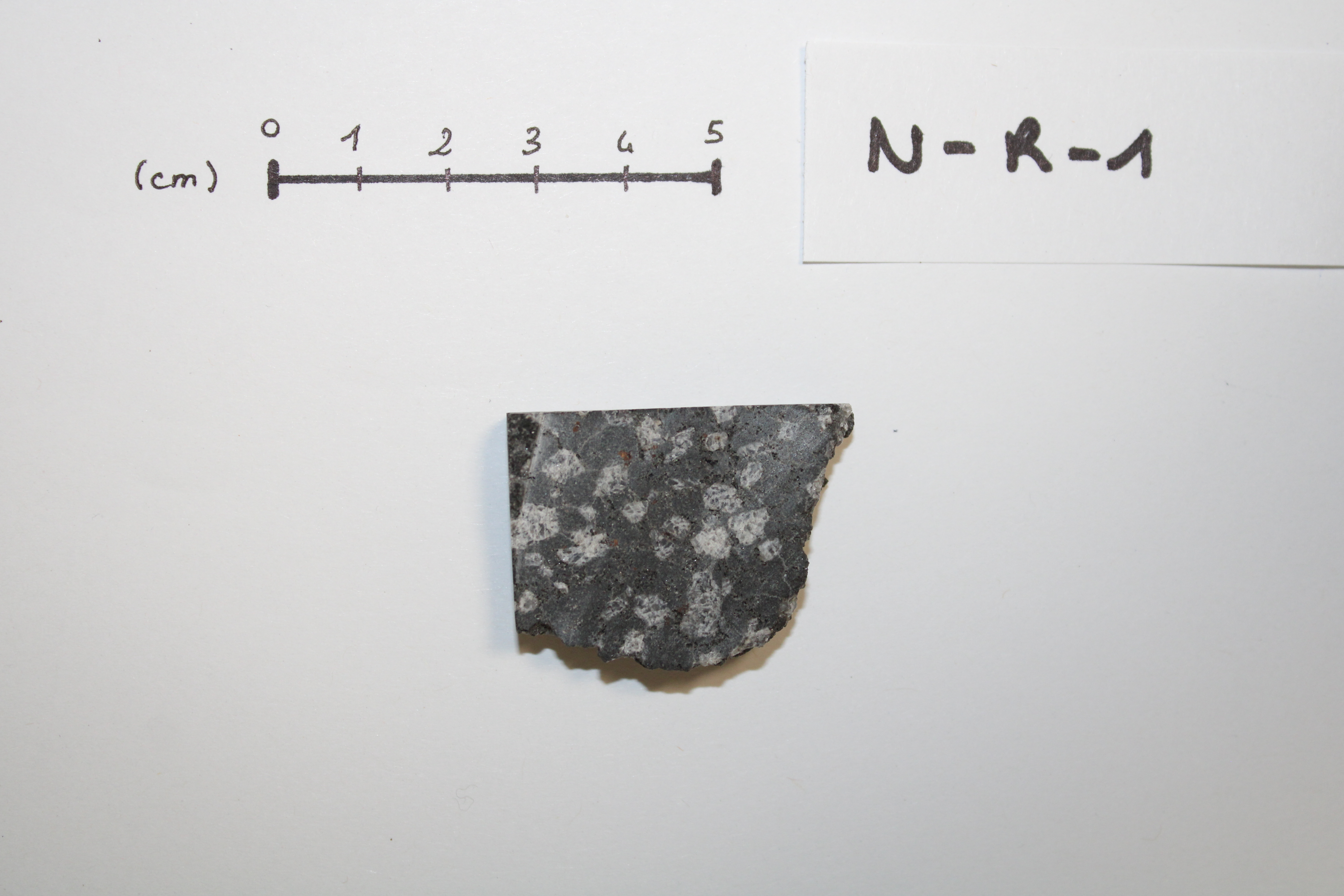 NR1 sample cut in the form of a sugar. This volcanic rock is mainly composed of plagioclase, and olivine (origin : Afar, ETHIOPIA).
