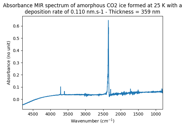 Absorbance MIR spectrum of amorphous CO2 ice formed at 25 K with a deposition rate of 0.110 nm.s-1 - Thickness = 359 nm