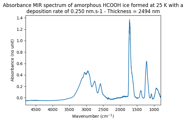 Absorbance MIR spectrum of amorphous HCOOH ice formed at 25 K with a deposition rate of 0.250 nm.s-1 - Thickness = 2494 nm