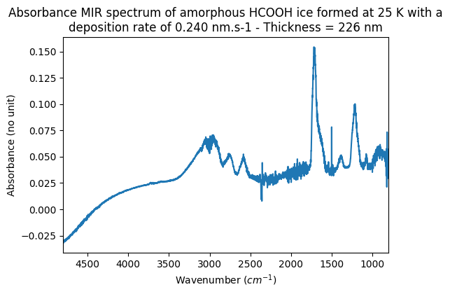 - Fray, Nicolas; Bouilloud, Michaëlle (2012): MIR absorbance spectra of amorphous HCOOH ice at 25K for different deposition rates and different thicknesses. SSHADE/SCOOP (OSUG Data Center). Dataset/Spectral Data. https://doi.org/10.26302/SSHADE/EXPERIMENT_NF_20250624_001