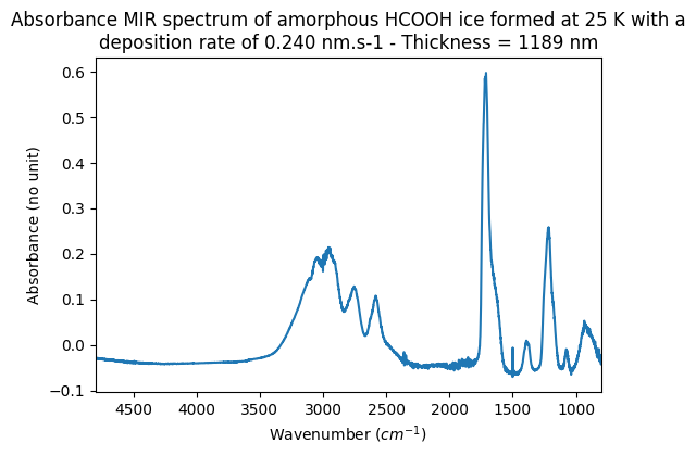 Absorbance MIR spectrum of amorphous HCOOH ice formed at 25 K with a deposition rate of 0.240 nm.s-1 - Thickness = 1189 nm