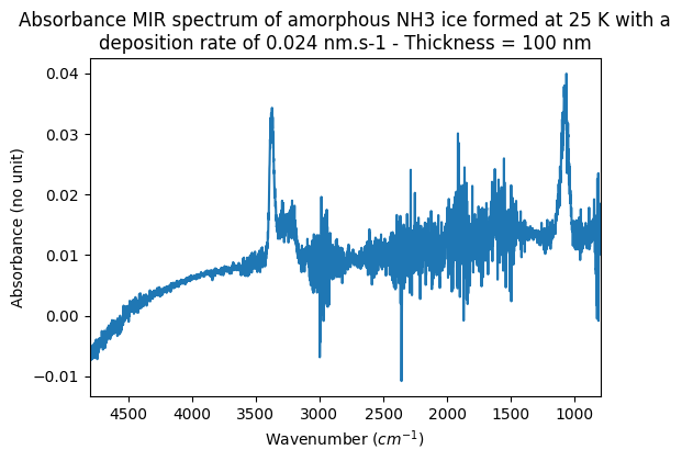 Absorbance MIR spectrum of amorphous NH3 ice formed at 25 K with a deposition rate of 0.024 nm.s-1 - Thickness = 100 nm