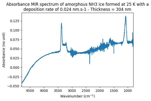 Absorbance MIR spectrum of amorphous NH3 ice formed at 25 K with a deposition rate of 0.024 nm.s-1 - Thickness = 304 nm