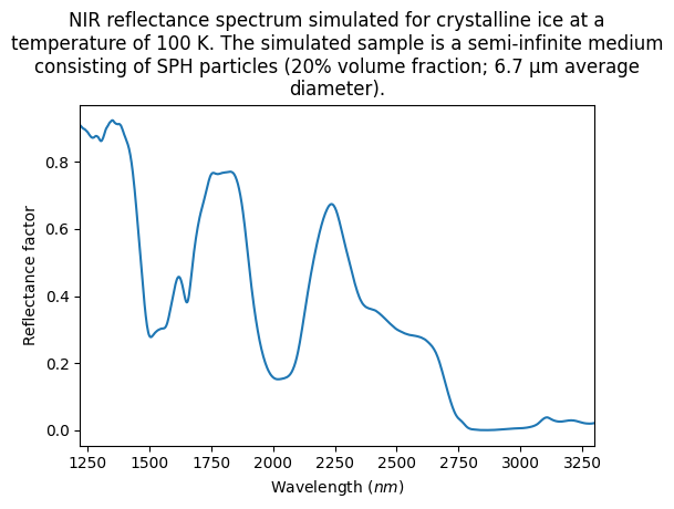 - NIR reflectance spectrum simulated for crystalline ice at a temperature of 100 K. The simulated sample is a semi-infinite medium consisting of SPH particles (20% volume fraction; 6.7 µm average diameter).