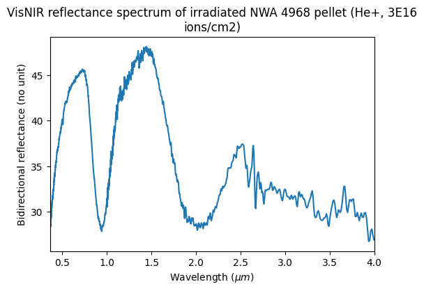 VisNIR reflectance spectrum of irradiated NWA 4968 pellet (He+, 3E16 ions/cm2)