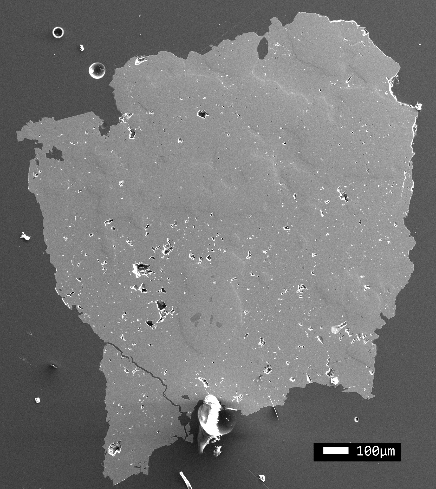 heterogeneous Dolomite grain (1.5 x 1.7 mm) with large Quartz inclusions, one with a few small Magnesite inclusions. Included in a finely polished epoxy resin pellet (# M1)