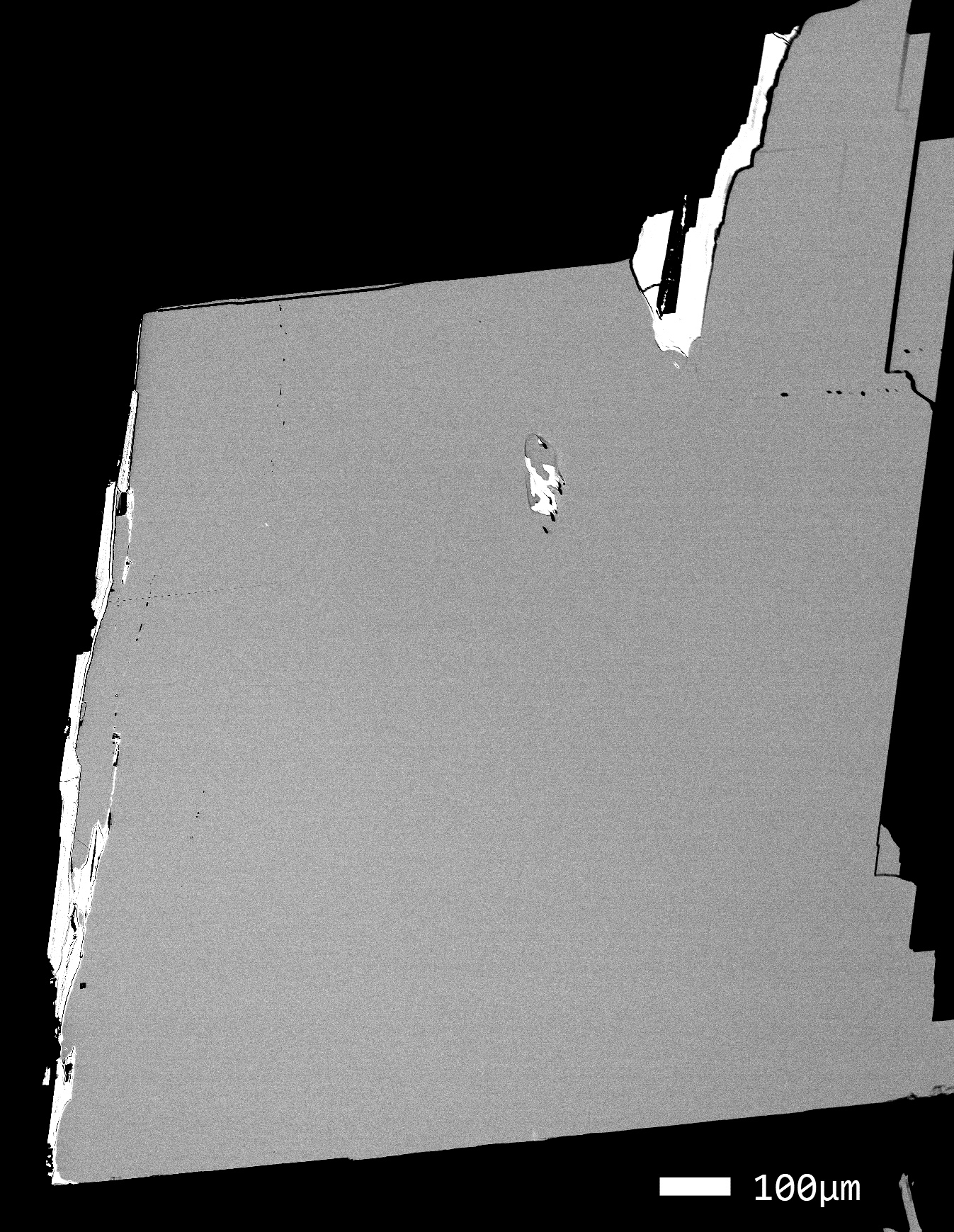 very homogeneous Mg-Siderite grain (1.2 x 1.2 mm) with local crust of Fe oxides. Included in a finely polished epoxy resin pellet (# M2)