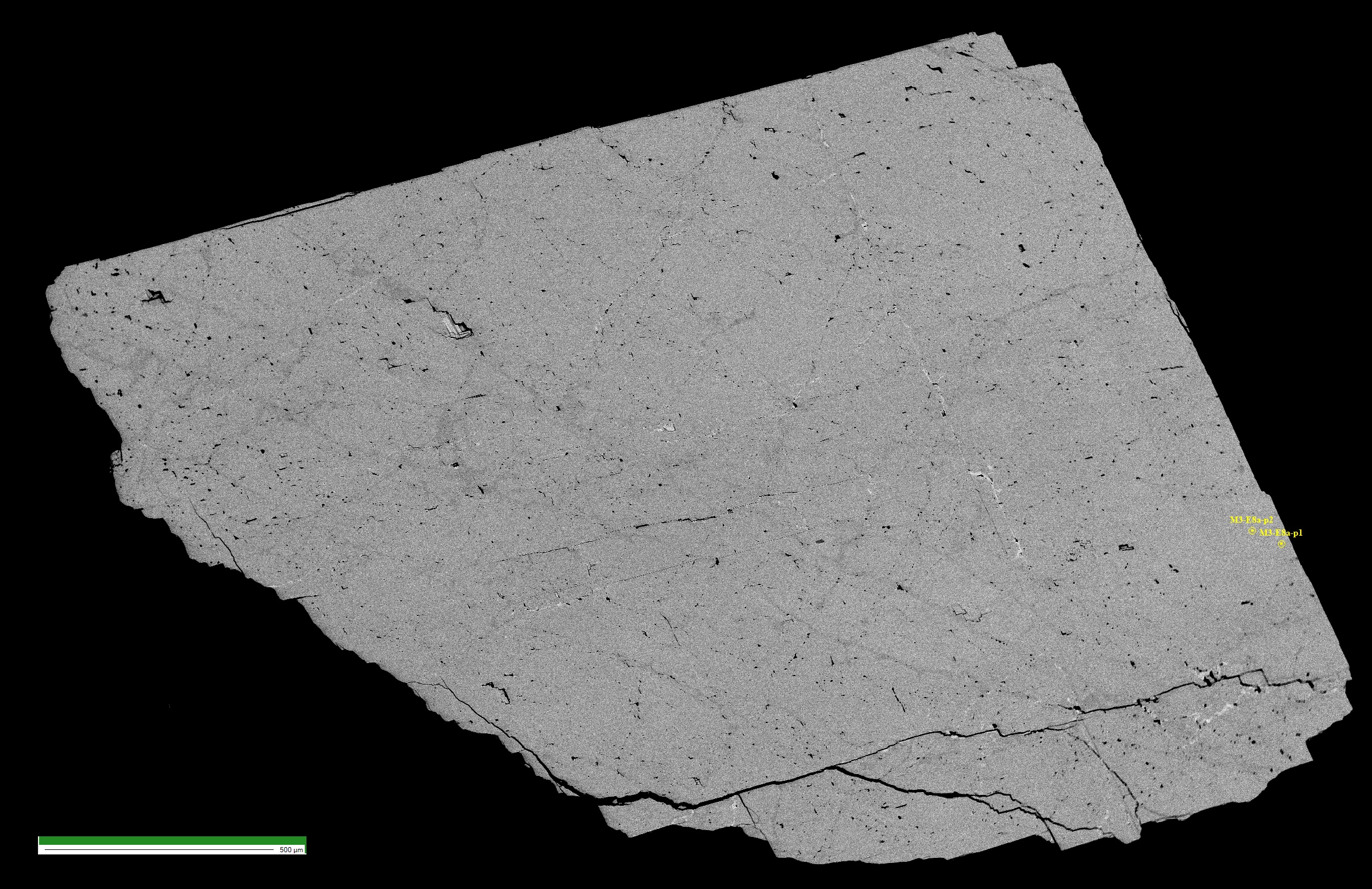 - very homogeneous grain (1.8 x 2.3 mm) with fractures, some possibly with minor Fe oxides. Included in a finely polished epoxy resin pellet (# M3)