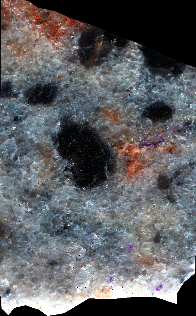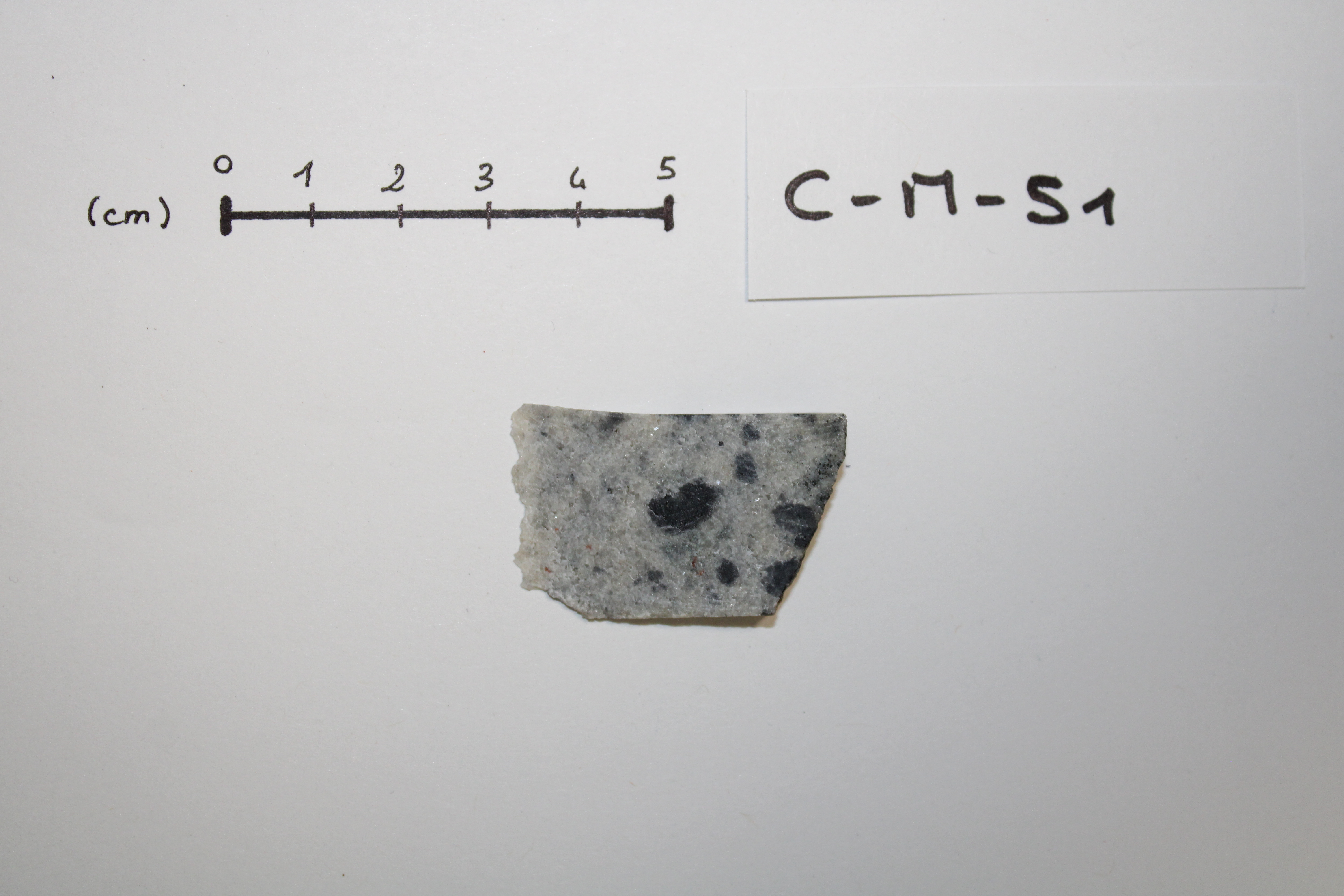 - CM51 sample cut in the form of a sugar. This plutonic rock is mainly composed of plagioclase, pyroxene and muscovite (origin : Grenville Province, CANADA).
