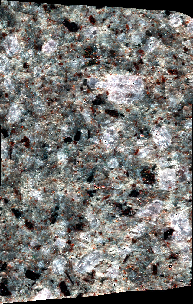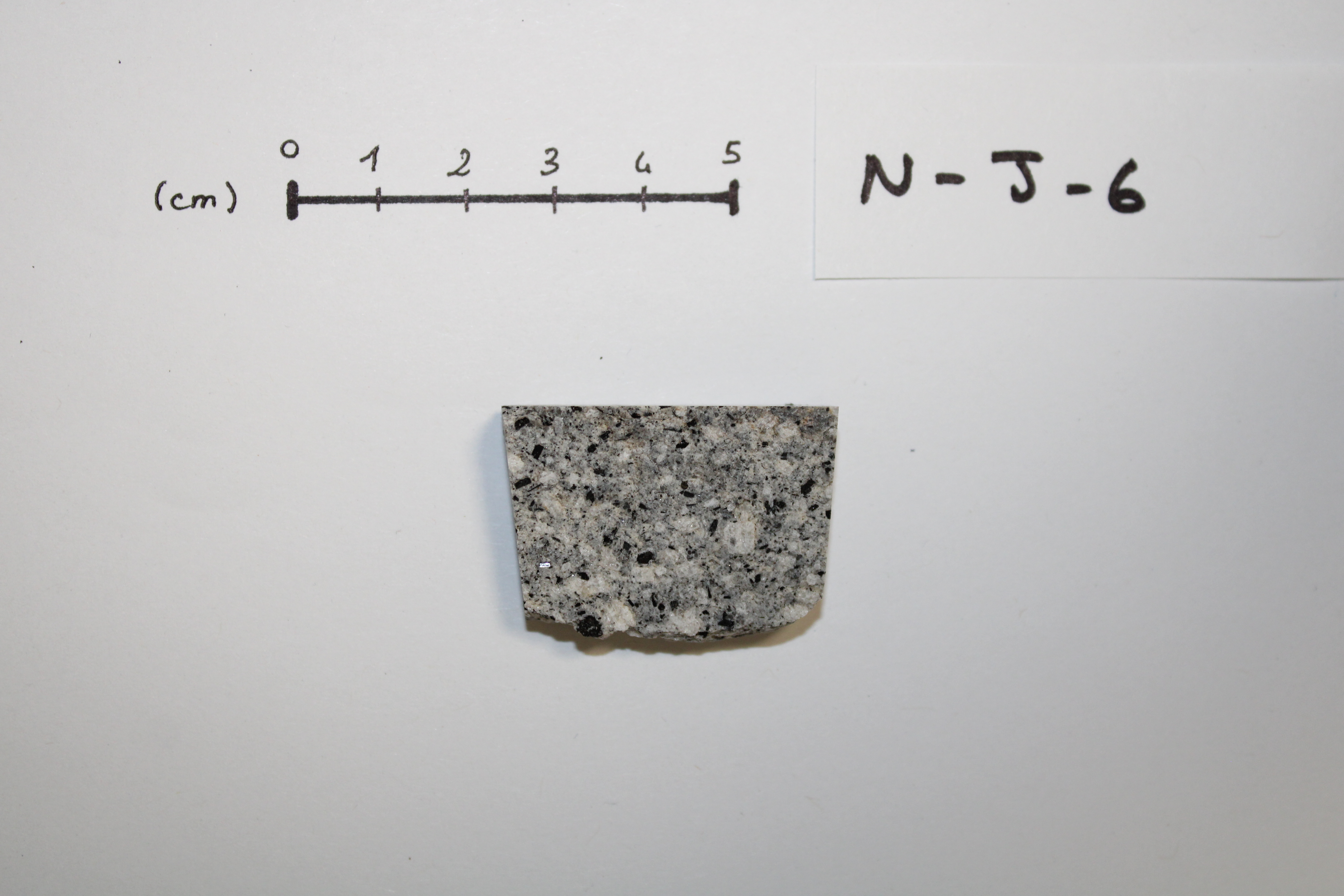- NJ6 sample cut in the form of a sugar. This volcanic rock is mainly composed of plagioclase, biotite, amphibole and K-feldspar (origin : Atacama, CHILE).
