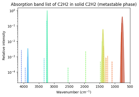 - Schmitt, Bernard and The SSHADE Band List Committee (2023): Absorption band list of C2H2 in solid C2H2 (metastable phase). Version 1. SSHADE (OSUG Data Center). Dataset/Band list Data.https://doi.org/10.26302/SSHADE/BANDLIST_ABS_C2H2_META-C2H2