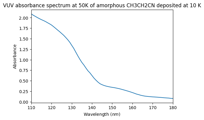 - Sivaraman, Bhalamurugan; Kushwaha, Rahul Kumar; Singh, Suendra Vikram (2015): VUV absorbance spectra between 10 and 130 K of amorphous CH3CH2CN deposited at 10 K. SSHADE/ACID (OSUG Data Center). Dataset/Spectral Data. https://doi.org/10.26302/SSHADE/EXPERIMENT_BMS_20150101_002