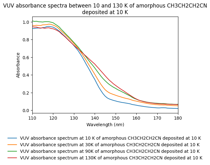 - VUV absorbance spectra between 10 and 130 K of amorphous CH3CH2CH2CN deposited at 10 K