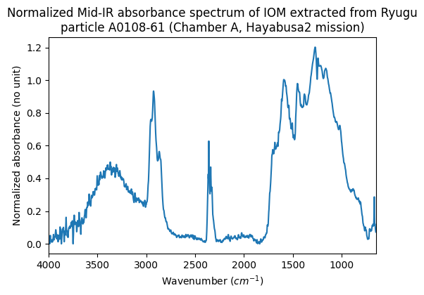 - Quirico, Eric; Bonal, Lydie; Amano, Kana; Phan Thai, Hai Van (2022): Normalized Mid-IR absorbance spectra of IOM extracted from fragments of individual particles and aggregates of Ryugu samples (chambers A and C, Hayabusa2 mission). SSHADE/GhoSST (OSUG Data Center). Dataset/Spectral Data. https://doi.org/10.26302/SSHADE/EXPERIMENT_BS_20230508_001