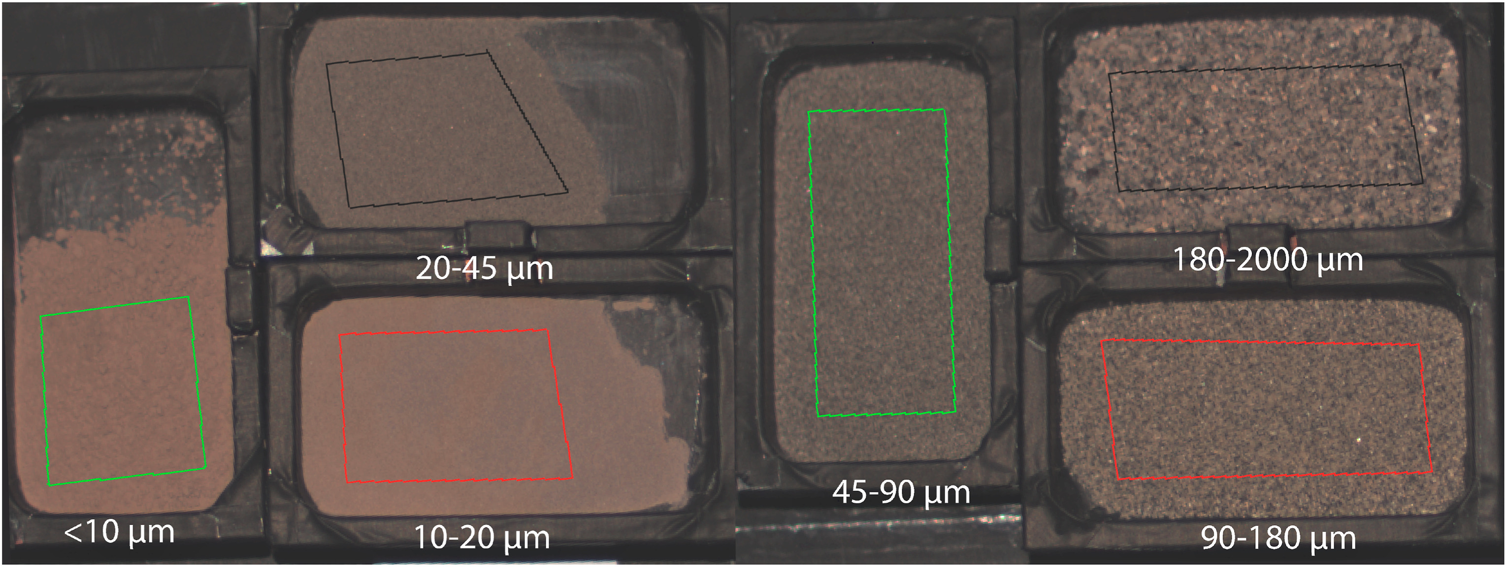 - Six different particle size fractions of the Mars regolith simulant MGS-1 were separated by dry sieving with a Varisfiter sonic separator. Their respective VIS-NIR reflectance spectra were then measured with the MoHIS hyperspectral imager.