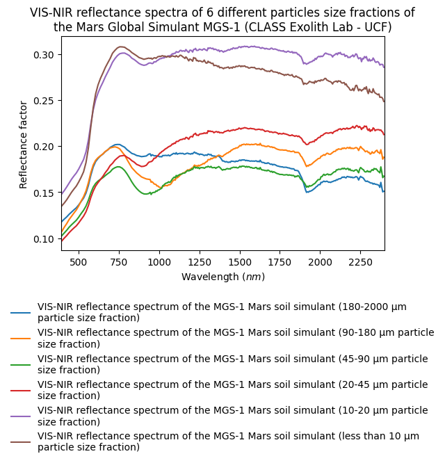 - VIS-NIR reflectance spectra of 6 different particles size fractions of the Mars Global Simulant MGS-1 (CLASS Exolith Lab - UCF)