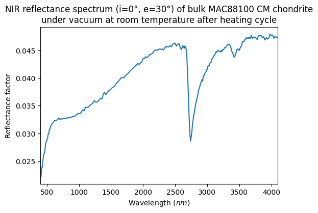 - Potin, Sandra; Beck, Pierre (2019): NIR reflectance spectrum (i=0°, e=30°) of bulk CM, CR, CI and ungrouped chondrites under vacuum at room temperature before and after a heating cycle. SSHADE/GhoSST (OSUG Data Center). Dataset/Spectral Data. https://doi.org/10.26302/SSHADE/EXPERIMENT_LB_20191216_001