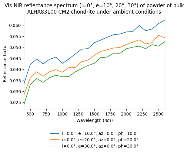 Vis-NIR reflectance spectrum (i=0°, e=10°, 20°, 30°) of powder of bulk ALHA83100 CM2 chondrite under ambient conditions