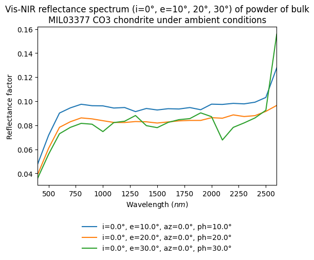 Vis-NIR reflectance spectrum (i=0°, e=10°, 20°, 30°) of powder of bulk MIL03377 CO3 chondrite under ambient conditions