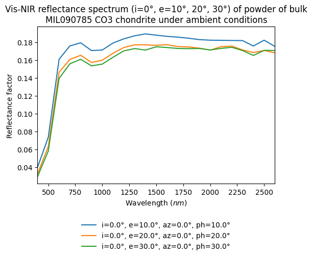 Vis-NIR reflectance spectrum (i=0°, e=10°, 20°, 30°) of powder of bulk MIL090785 CO3 chondrite under ambient conditions
