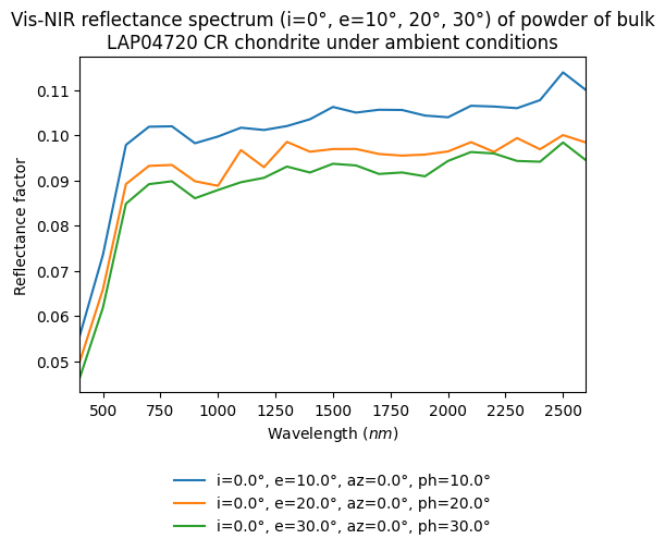 Vis-NIR reflectance spectrum (i=0°, e=10°, 20°, 30°) of powder of bulk LAP04720 CR chondrite under ambient conditions