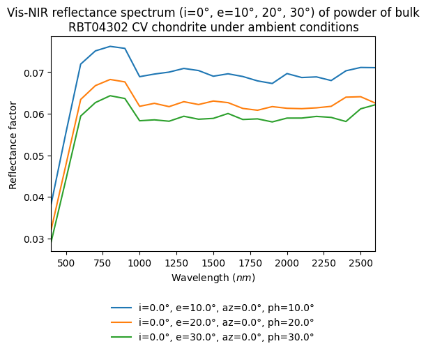 Vis-NIR reflectance spectrum (i=0°, e=10°, 20°, 30°) of powder of bulk RBT04302 CV chondrite under ambient conditions