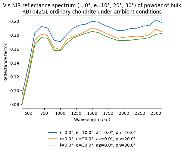Vis-NIR reflectance spectrum (i=0°, e=10°, 20°, 30°) of powder of bulk RBT04251 ordinary chondrite under ambient conditions