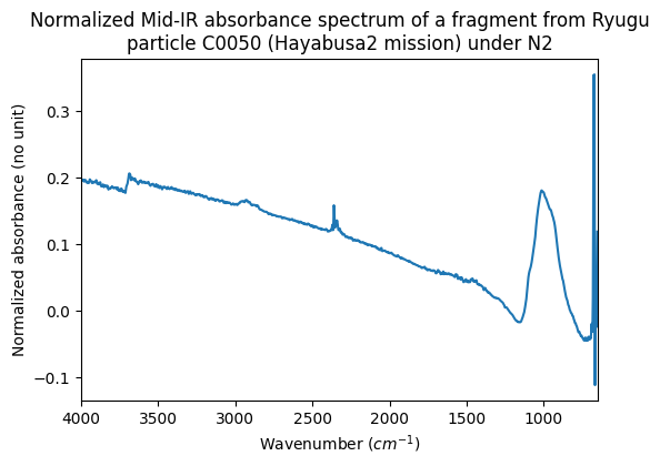 Normalized Mid-IR absorbance spectrum of a fragment from Ryugu particle C0050 (Hayabusa2 mission) under N2