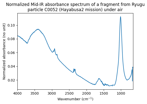 Normalized Mid-IR absorbance spectrum of a fragment from Ryugu particle C0052 (Hayabusa2 mission) under air
