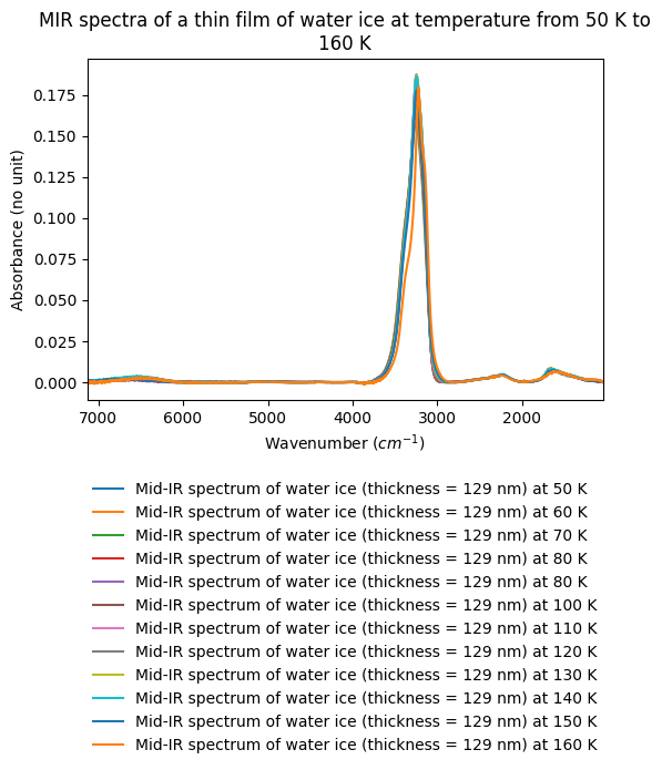 - MIR spectra of a thin film of water ice deposited at 50 K and progressively heated from 50 K (amorphous ice) to 160 K (crystalline ice)
