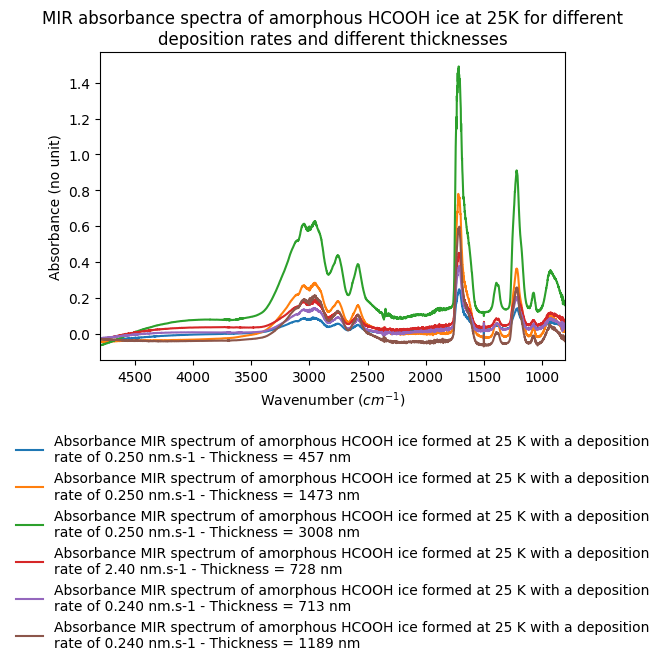 - MIR absorbance spectra of amorphous HCOOH ice at 25K for different deposition rates and different thicknesses