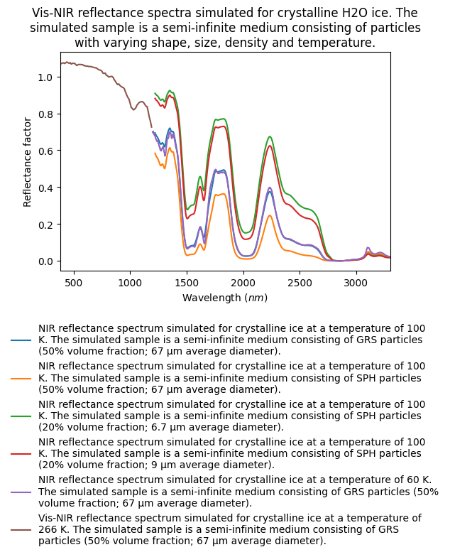 - Vis-NIR reflectance spectra simulated for crystalline H2O ice. The simulated sample is a semi-infinite medium consisting of particles with varying shape, size, density and temperature.