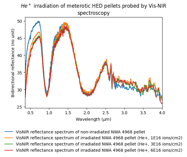 - Visible and Near-IR spectra of meteoritic pellets at different irradiation fluences of $He^+$ (40 keV).