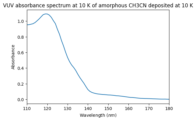 - Sivaraman, Bhalamurugan; Kushwaha, Rahul Kumar; Singh, Suendra Vikram (2015): VUV absorbance spectra between 10 and 120 K of amorphous CH3CN deposited at 10 K. SSHADE/ACID (OSUG Data Center). Dataset/Spectral Data. https://doi.org/10.26302/SSHADE/EXPERIMENT_BMS_20150101_001