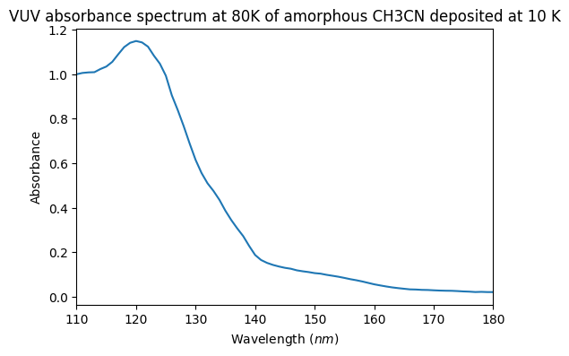 - Sivaraman, Bhalamurugan; Kushwaha, Rahul Kumar; Singh, Suendra Vikram (2015): VUV absorbance spectra between 10 and 120 K of amorphous CH3CN deposited at 10 K. SSHADE/ACID (OSUG Data Center). Dataset/Spectral Data. https://doi.org/10.26302/SSHADE/EXPERIMENT_BMS_20150101_001
