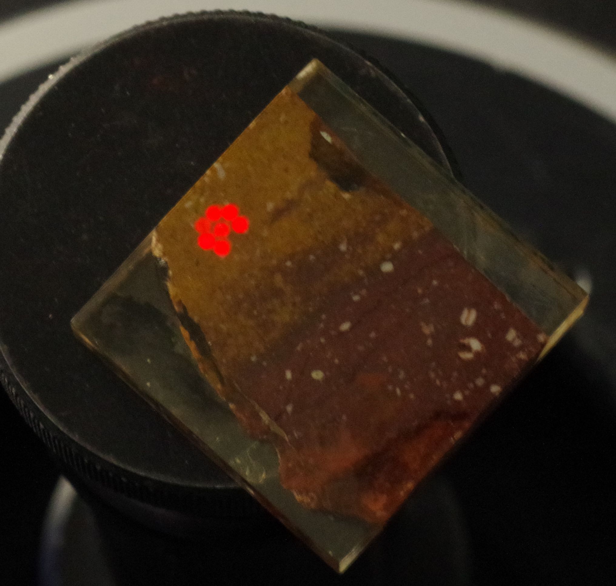 - measured on face 1, on the red part, in the center of a zone without white inclusion (spot #1)