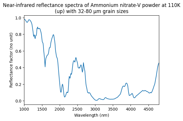 - Fastelli, Maximiliano; Comodi, Paola; Schmitt, Bernard; Beck, Pierre; Poch, Olivier (2020): Near-infrared reflectance spectra at low temperature (300-70K) of Ammonium nitrate-IV and -V [(NH4)NO3] powders with three grain size ranges (32-80, 80-125 and 125-150µm). SSHADE/CSS (OSUG Data Center). Dataset/Spectral Data. https://doi.org/10.26302/SSHADE/EXPERIMENT_BS_20201114_015