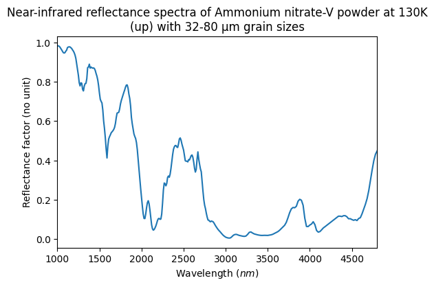 - Fastelli, Maximiliano; Comodi, Paola; Schmitt, Bernard; Beck, Pierre; Poch, Olivier (2020): Near-infrared reflectance spectra at low temperature (300-70K) of Ammonium nitrate-IV and -V [(NH4)NO3] powders with three grain size ranges (32-80, 80-125 and 125-150µm). SSHADE/CSS (OSUG Data Center). Dataset/Spectral Data. https://doi.org/10.26302/SSHADE/EXPERIMENT_BS_20201114_015