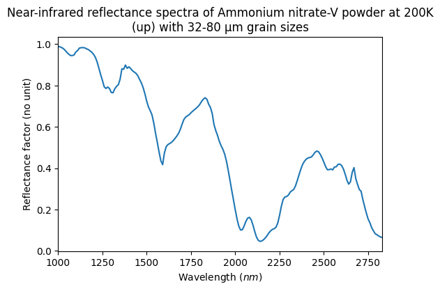 Near-infrared reflectance spectra of Ammonium nitrate-V powder at 200K (up) with 32-80 µm grain sizes