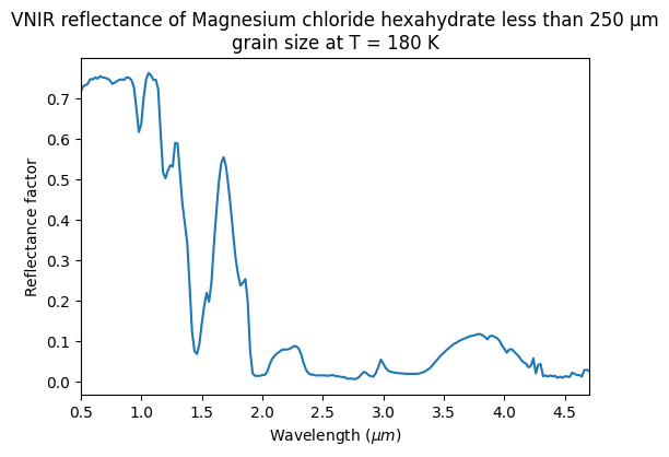 - DeAngelis, Simone; Carli, Cristian; Tosi, Federico; Beck, Pierre; Brissaud, Olivier; Schmitt, Bernard; Potin, Sandra (2019): VNIR reflectance spectra of Magnesium chloride hexahydrate with 3 different grain sizes and at variable temperature (80-295 K). SSHADE/REFL_SLAB+CSS (OSUG Data Center). Dataset/Spectral Data. https://doi.org/10.26302/SSHADE/EXPERIMENT_CC_20190501_02