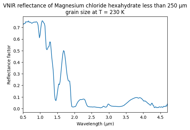 - DeAngelis, Simone; Carli, Cristian; Tosi, Federico; Beck, Pierre; Brissaud, Olivier; Schmitt, Bernard; Potin, Sandra (2019): VNIR reflectance spectra of Magnesium chloride hexahydrate with 3 different grain sizes and at variable temperature (80-295 K). SSHADE/REFL_SLAB+CSS (OSUG Data Center). Dataset/Spectral Data. https://doi.org/10.26302/SSHADE/EXPERIMENT_CC_20190501_02