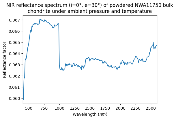 NIR reflectance spectrum (i=0°, e=30°) of a section of NWA11750 chondrite under ambient pressure and temperature