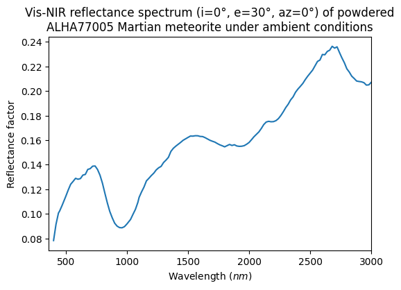- Mandon, Lucia; Beck, Pierre (2018): Vis-IR reflectance spectra (i=0°, e=30°, az=0°) of bulk (powders or raw pieces) Martian meteorites. SSHADE/ROMA+GhoSST (OSUG Data Center). Dataset/Spectral Data. https://doi.org/10.26302/SSHADE/EXPERIMENT_LB_20210512_001