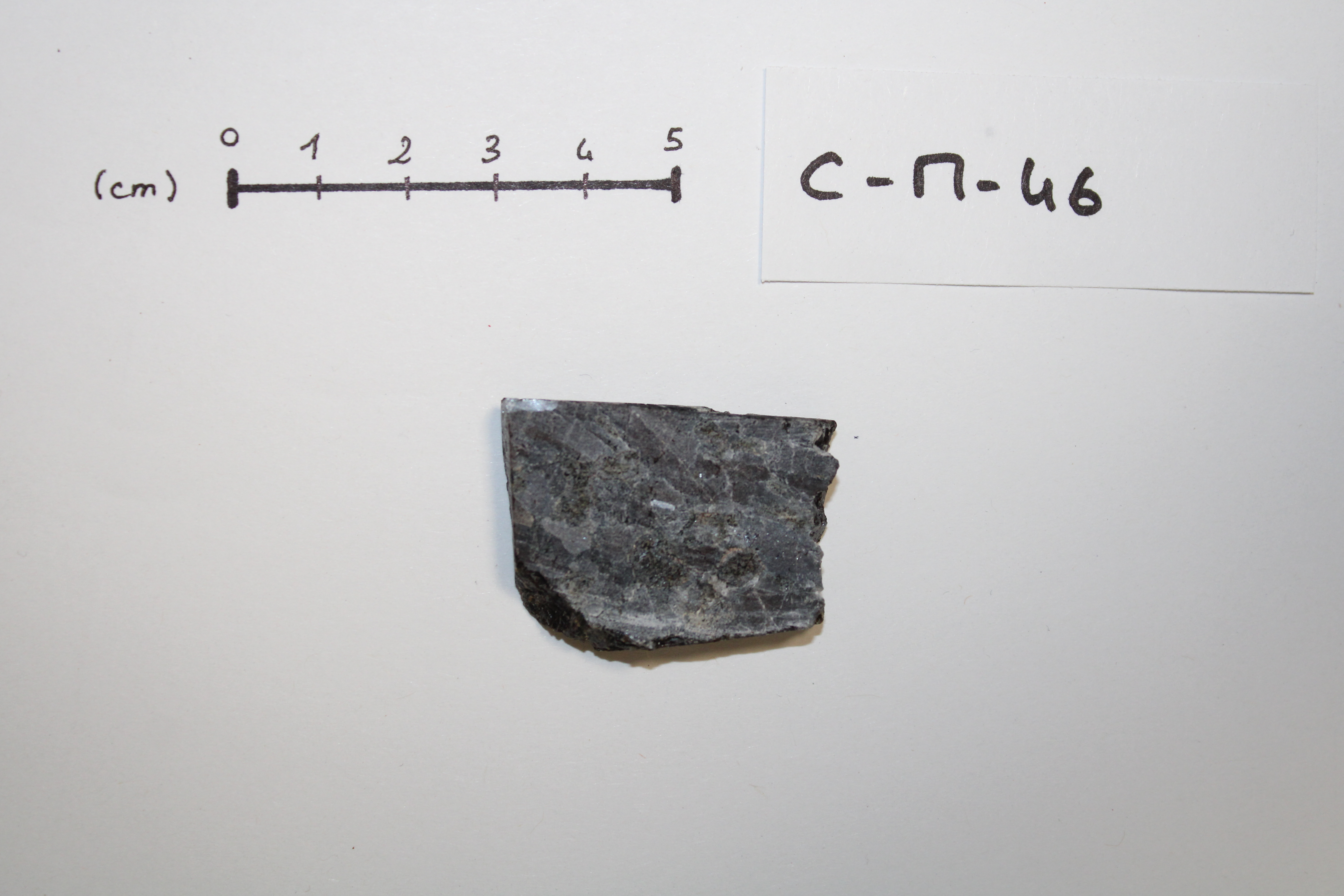 - CM46 sample cut in the form of a sugar. This plutonic rock is mainly composed of plagioclase, pyroxene and olivine (origin : Grenville Province, CANADA).