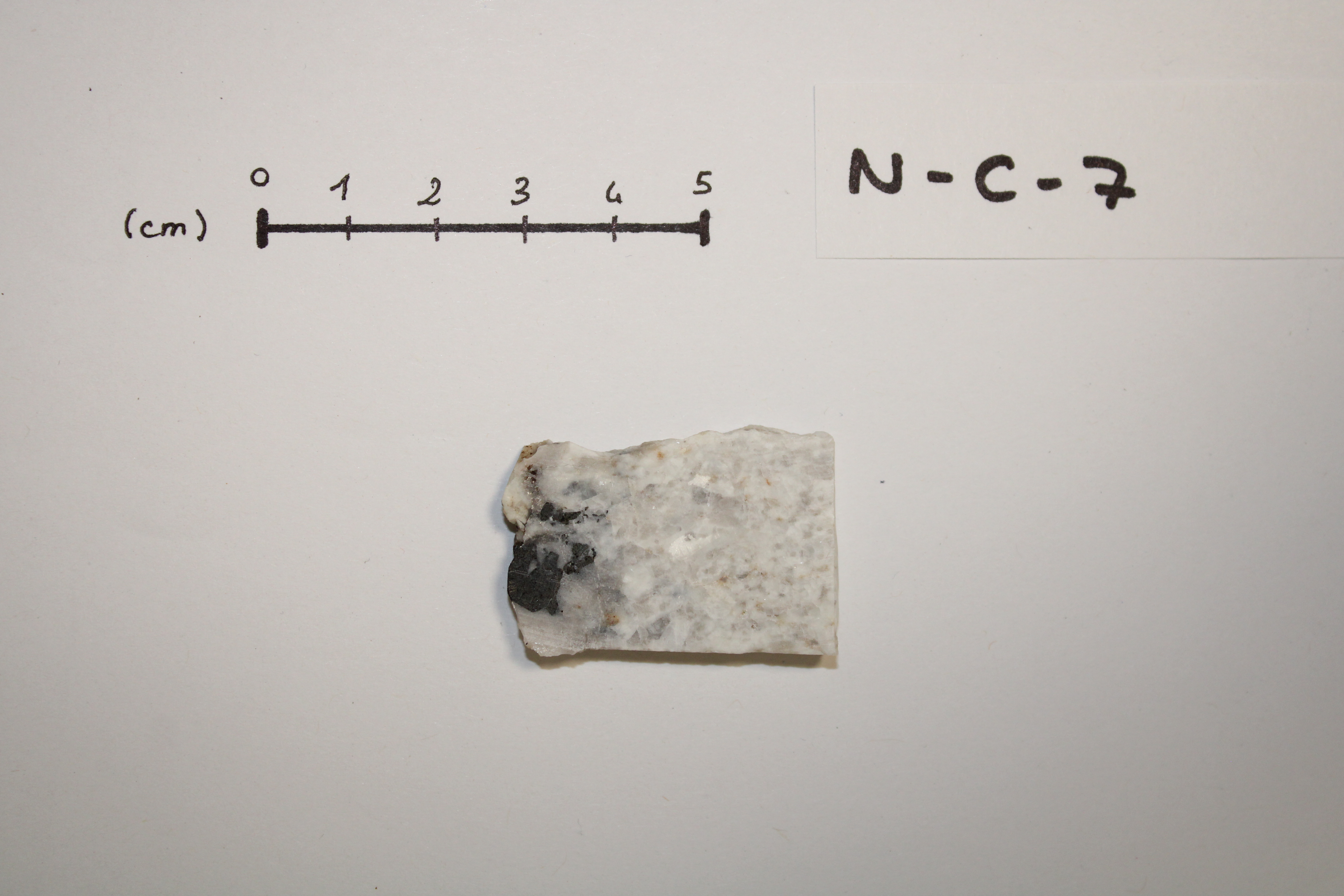 NC7 sample cut in the form of a sugar. This plutonic rock is mainly composed of plagioclase, quartz, K-feldspar, tourmaline and muscovite.